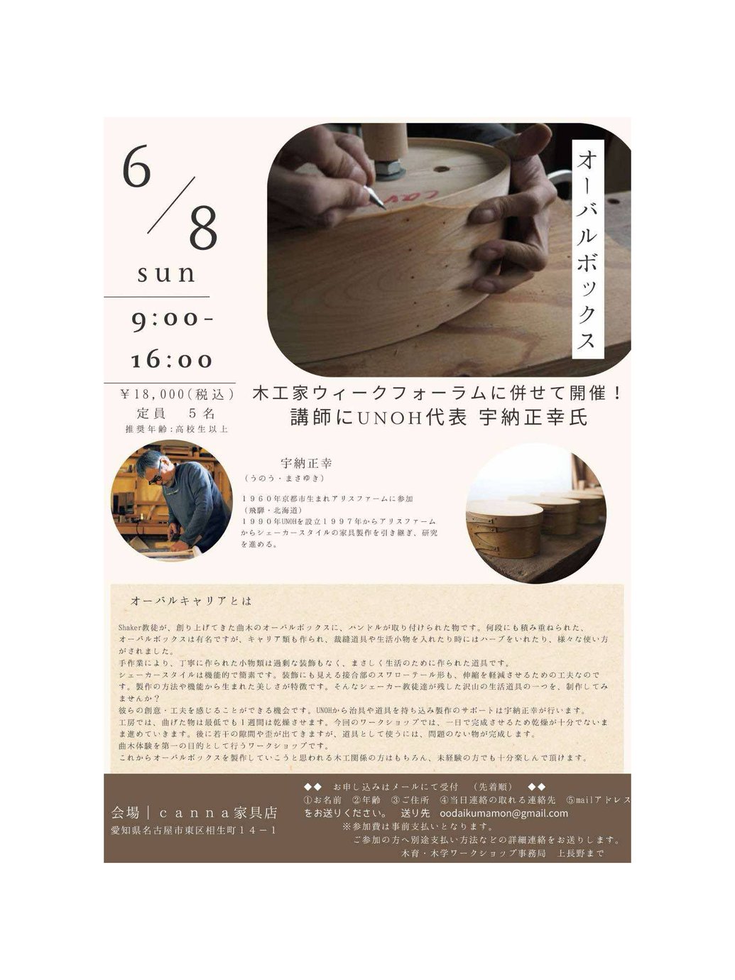 オーバルボックスワークショップ 木工家ウィークフォーラムに併せて開催! ※定員に達したので募集終了しました。 講師にUNOH代表 宇納正幸氏 日時:6/8(日)9:00~16:00 料金:¥18,000(税込) 定員 5名 推奨年齢:高校生以上 会場:canna家具店 愛知県名古屋市東区相生町14-1 お申し込みはメールにて受付(先着順) ①お名前2年齢③ご住所④当日連絡の取れる連絡先 Smailアドレス...